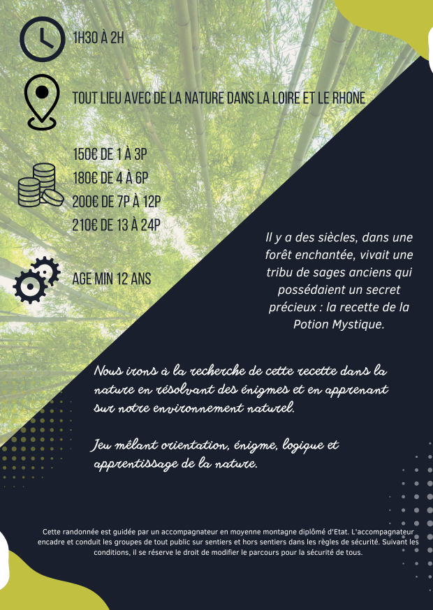 Dans cet escape game nature, les participants se retrouvent plongés dans la nature avec une mission : retrouver la recette d'une potion mystique cachée par des lutins malicieux. Jeu mêlant orientation, énigme, logique et apprentissage de la nature.