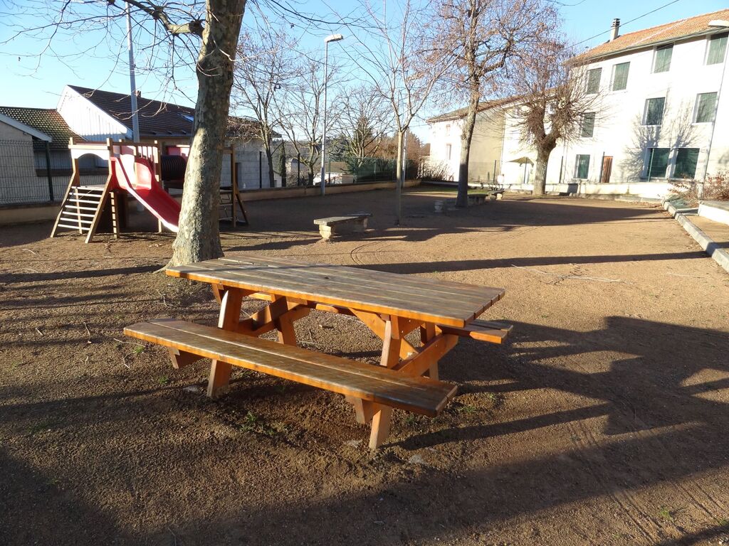 Aire de pique nique avec jeux pour enfants et terrain de pétanque.