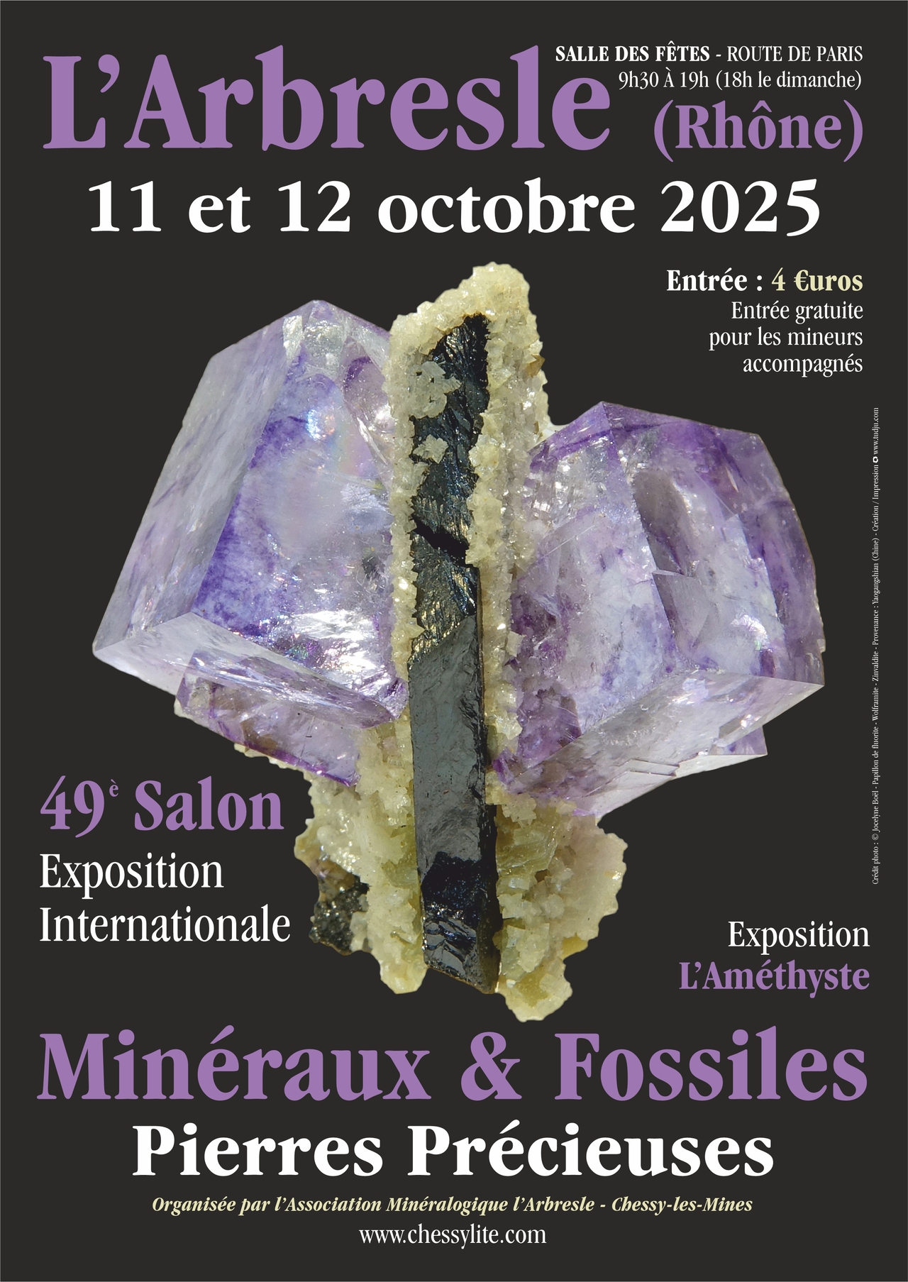 Salon minéralogique de grande importance où petits et grands, curieux, experts et néophites peuvent contempler et acheter des minéraux de collections, des roches et fossiles d'intérêts. Un véritable musée éphémère des merveilles de la planète. Une exposition sur un minéral bien connu, l'améthsyte, qu'elle soit de la région ou du monde entier. Présentation en avant première du livre posthume de J. Gastineau sur les mines et minéraux du Lyonnais et du Beaujolais.
