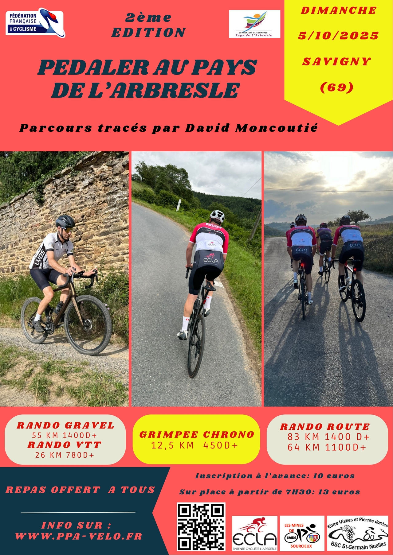 Les différentes disciplines sont organisées par les clubs cyclistes du Pays de l'Arbresle : Grimpée Chronométrée & Randonnées, Rando route, Rando gravel, Rando VTT... Repas offert à tous.