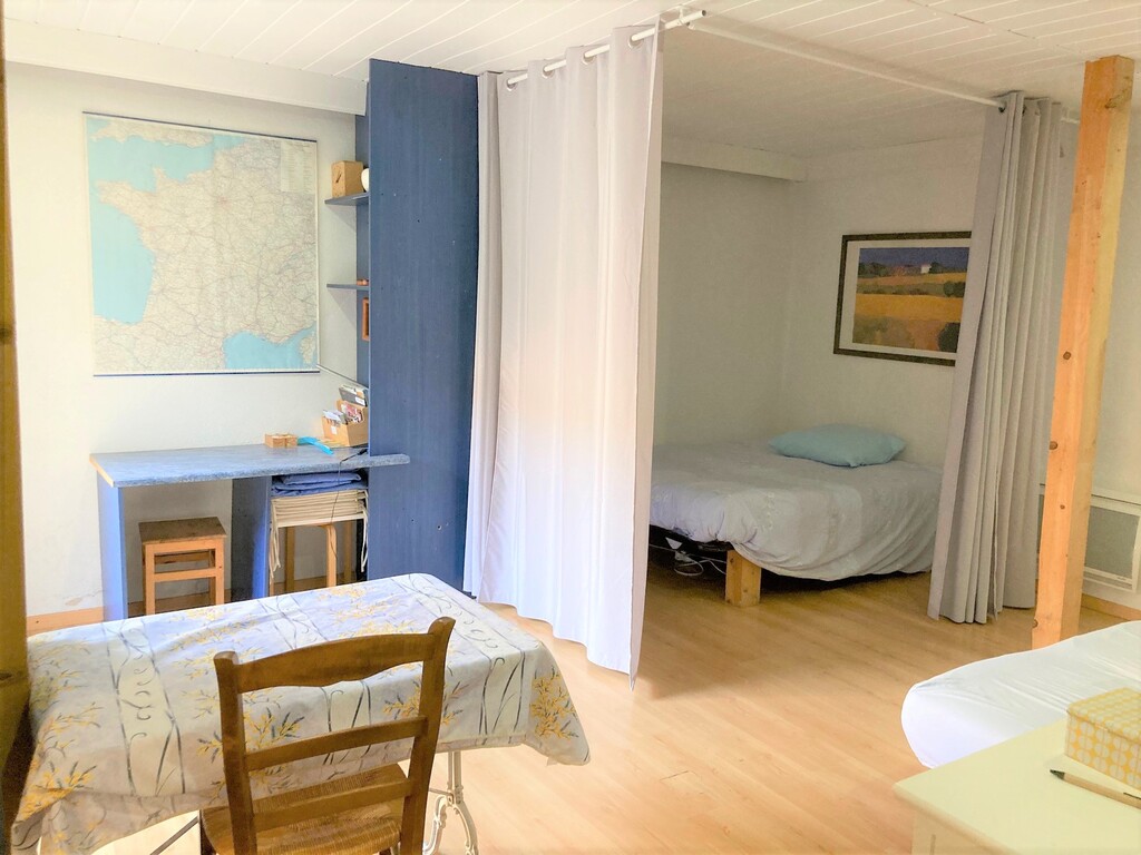 Meublé de 56m² type studio, avec un coin bureau, zone repas, coin kitchenette avec évier, frigo, plaque 2 feux, zone salon avec canapé convertible et télé, un espace sommeil avec un grand lit et un autre espace avec 2 lits simples.