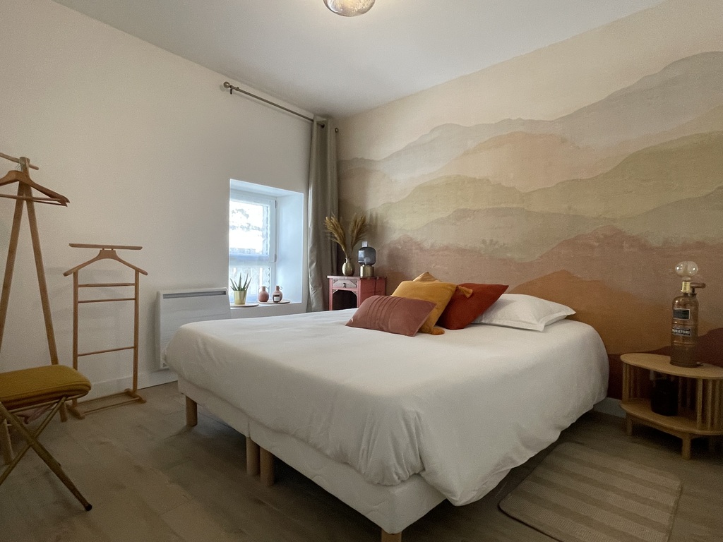Au 1er étage : 1 chambre avec lit 160cm / 1 chambre avec lit 140cm et dressing / une salle d’eau avec douche italienne, double vasque / 1 WC / un salon avec Tv (le canapé peut accueillir un couchage pour 2 personnes, intimité faite avec des panneaux japonais)